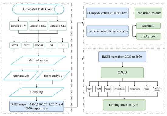 The detailed workflow of this study is shown in Figure 2. First, the study calculated five indicators: WET, NDVI, NDBSI, LST, and AI. By coupling AHP and EWM, the weights of the five indicators were obtained and then used to construct the Improved remote sensing ecological index (IRSEI) to generate ecological quality maps for the years 2000, 2006, 2011, 2015, and 2020. The study used transfer matrices and spatial autocorrelation to analyze these data. Then, the OPGD model was used to analyze the driving factors of ecological environment quality from 2000 to 2020.