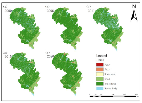 Based on the combined weights, a raster calculator was used to obtain the IRSEI values. By the pertinent standards [18], the ecological environment quality of the research region was classified into five categories as delineated in Table 3.