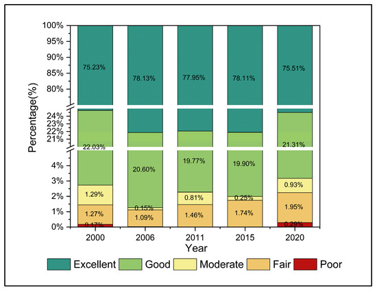 Percentages of different IRSEI quality levels from 2000 to 2020.