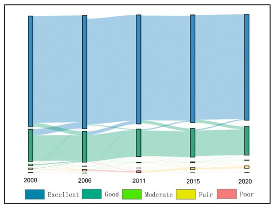 In order to explore the changes in the ecological quality of each ecological level, the study used a transfer matrix to present a detailed evolution of the ecological quality from 2000 to 2020 (Figure 5). The area of the excellent grade increased between 2000 and 2006. During this time period, the government adopted the Grain for Green Project. This transformed farmlands into forests and grasslands, which then enhanced the forest cover. After 2006, there was a small decrease. The area of the good grade decreased slowly between 2000 and 2011 and increased slowly between 2011 and 2020. The area of the poor grade increased between 2006 and 2011, decreased between 2011 and 2015, and remained stable for the rest of the period.