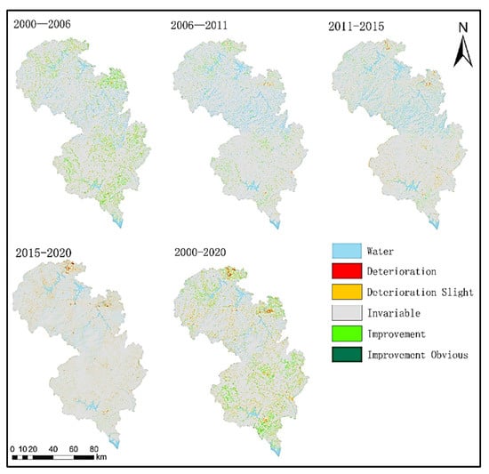This study used a spatial analysis method to investigate the spatial and temporal changes in ecological quality between 2000 and 2020 based on the transfer matrix (Figure 6). The improvement area of ecological quality was mainly in the northern and southern parts of the study area from 2000 to 2006. The unchanged area dominated the ecological quality from 2006 to 2015. There was a deterioration trend in a very small area in the northern part of the study area from 2015 to 2020, which was dominated by the built-up area. Overall, the ecological environment quality of most forests and grasslands in the Anhui Dabie Mountain area remained unchanged from 2000 to 2020, the ecological environment quality of some farmland improved, and the ecological environment quality of a small part of the built-up area deteriorated.