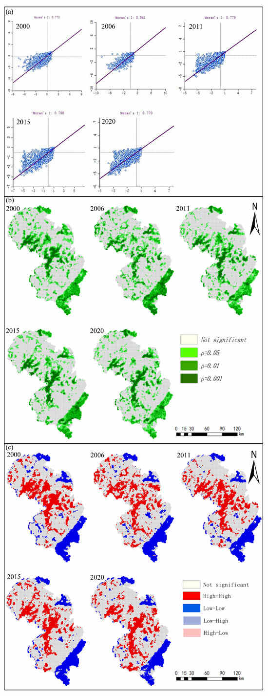 To analyze the spatial autocorrelation of the IRSEI from 2000 to 2020, the study employed Moran’s I index, significance mapping, and LISA clustering to analyze spatial patterns (Figure 7). The results showed that the Moran’s I values were consistently maintained between 0.77 and 0.85, indicating that the spatial distribution of ecological environment quality in the study area was characterized by highly positive spatial clustering (Figure 7a). The significance map showed that the non-significant areas were mainly distributed in the central-north and central-south regions of the study area, which were the transition areas between built-up areas, farmland, and forested land, implying that the environmental conditions in these areas were more complicated (Figure 7b). At the 95% confidence level, the “High–High” agglomeration was widely distributed in the central part of the study area and had good ecological environment quality, as well as high ecological environment quality in the neighboring areas. The area was dominated by forest and grassland, with high elevation, high vegetation cover, and good environmental background values. The “low–low” clusters were concentrated in the farmland in the south and the built-up area in the north. The ecological environment quality of these areas was poor, as was that of the adjacent areas. The region had a gentle topography and high impact of human activities. This suggested that the ecological quality of the Anhui Dabie Mountain area showed a polarized pattern.