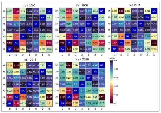 Plot of driving factor interaction detection results (X1 represents GDP, X2 represents aspect, X3 represents slope, X4 represents DEM, X5 represents temperature, X6 represents population density, X7 represents precipitation. Subfigures represented the results of different years).