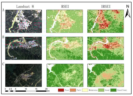Comparison of Landsat, RSEI, and IRSEI in Localized Areas in 2020, (A–C) represented three different regions.