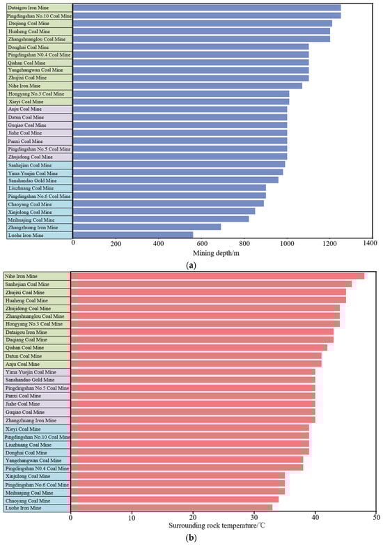 Mineral resources are among the most abundant and widely distributed energy resources globally, playing pivotal roles in economic development, energy security, and industrial production [1,2]. With the gradual depletion of shallow energy and mineral resources, mine mining has progressively extended to greater depths [3]. Currently, the maximum mining depth in China is 1500 m, with over 130 mines exceeding 700 m in depth [4]. In China, shallow coal resources constitute less than 20% of the total reserves whereas coal resources below 1000 m account for 80%. Deep mineral resources are abundant, significantly enhancing the stability and sustainability of energy supply and representing the principal direction for future mine development. During deep mine mining, heat damage problems become particularly pronounced. As indicated by statistical data, when mining depths reach 1000 m, the surrounding rock temperatures can reach 35 °C to 45 °C, with geothermal gradients increasing by 1 °C to 3 °C per 100 m. The mining depths and surrounding rock temperatures of typical deep mines in China are shown in Figure 1a and Figure 1b, respectively. It can be observed that an increase in the mining depth in deep mines results in higher temperatures of the surrounding rock.