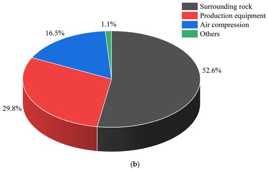 Figure 2 shows the proportion of various heat sources contributing to mine heat damage in typical mines. As depicted in Figure 2a, in the Sanshandao Gold Mine, Shandong Province, China, other heat sources, including mineral oxidation and mine water, accounted for 35.9% of the total mine heat, and the surrounding-rock heat dissipation constituted 30.5%. Figure 2b shows that the surrounding-rock heat dissipation contributed 52.6% of the total mine heat in the Xiadian Gold Mine, Shandong Province, China, making it the primary factor causing high temperatures. To address deep-mine heat damage, targeted technical designs should focus on predominant heat sources to ensure effective thermal management and safe mining.