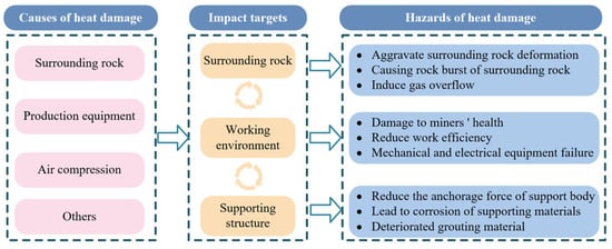 Deep-mine heat damage manifests as high-temperature and high-humidity air conditions on the working face, negatively impacting the production process. The hazards primarily affect four key areas: the surrounding rock, working environment, supporting structure, and other hazards. Figure 3 illustrates the relationship between the causes of mine heat damage, their impact targets, and the resulting heat damage.