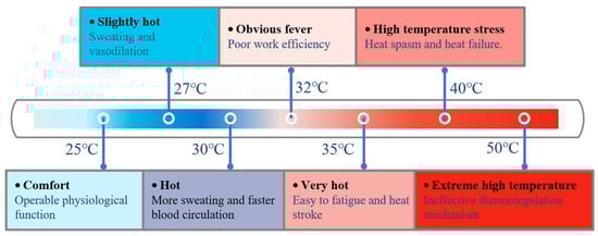 The adverse effects of mine heat damage on the working environment are primarily manifested as high-temperature and high-humidity conditions at the working face, which negatively impact miners’ health, work efficiency, and the service life of electromechanical equipment. The impact of the ambient temperature on human physiological performance is shown in Figure 4. In high-temperature environments, critical physiological functions such as body temperature regulation are disrupted, leading to elevated body temperatures, tachycardia, and hypertension [22]. Prolonged exposure to high-temperature and high-humidity environments predisposes miners to heat fatigue, heat stroke, and heat exhaustion, with severe cases potentially resulting in fatalities [23,24]. Ismail et al. [25] investigated the physiological responses of workers to high-temperature and high-humidity environments, indicating that significant impacts on heart rate and maximal oxygen consumption occurred. Prolonged work under these conditions leads to miner fatigue and weakness, thereby reducing work efficiency and safety [26]. Additionally, such environments accelerate equipment wear and aging, thereby increasing the failure rates.