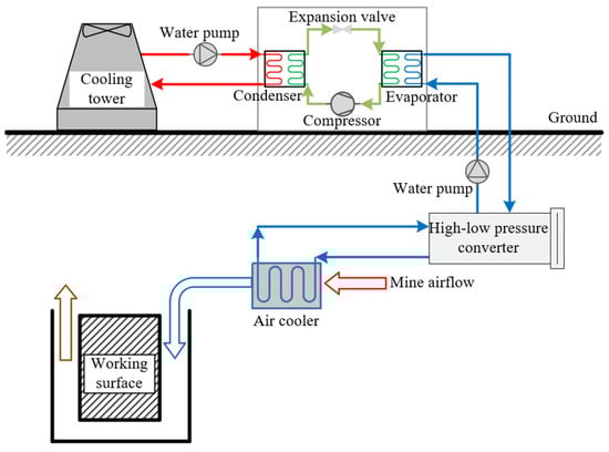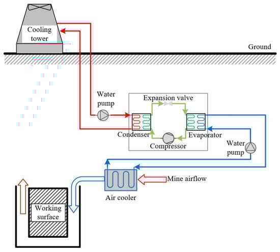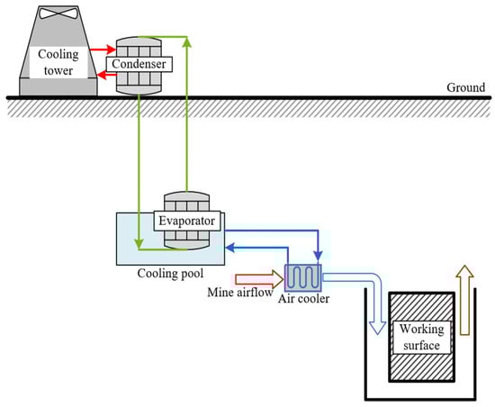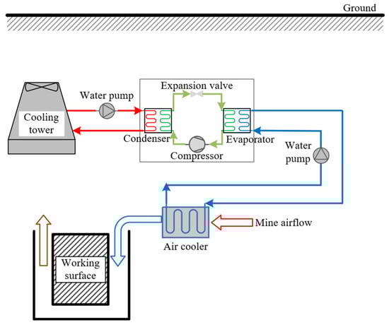 The GHR&URCS integrates the advantages of both the GCRCS and the UCRCS. The refrigeration unit is positioned underground. The generated cold energy is transported to the working face air cooler to cool the mine airflow whereas condensing heat is directed to a ground cooling tower for dissipation [48]. Figure 7 shows the principle of the GHR&URCS. This system enables the efficient condensation of heat emissions via ground cooling towers, minimizing cold loss. However, an increased distance between the cooling tower and refrigeration unit can lead to a loss of cooling capacity in the cooling water circuit.