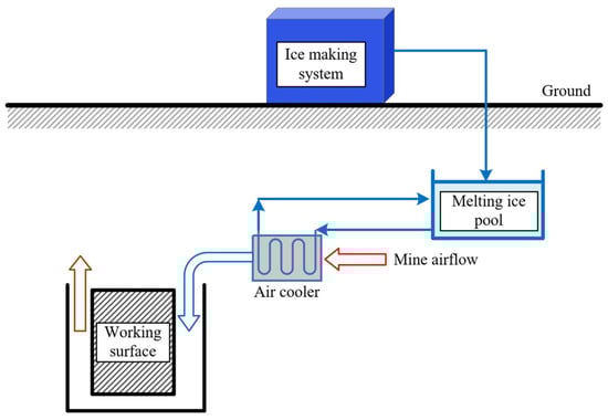 The ice-cooled refrigeration cooling system utilizes the latent heat of ice melting to cool the mine airflow. Solid ice or ice–water mixtures prepared on the ground are transported to underground ice melting pools for dissolution. The resulting low-temperature water is then conveyed to the working face air cooler to cool the mine airflow [49]. This system comprises four key steps: ice making, ice transportation, ice melting, and ice utilization. The principle of the ice-cooled refrigeration cooling system is illustrated in Figure 8.