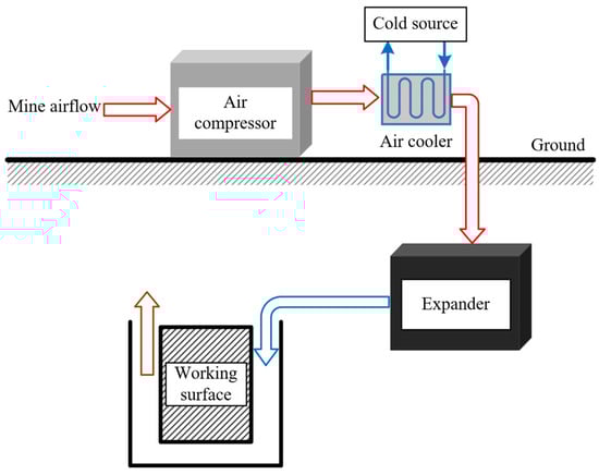 Air-cooled refrigeration cooling technology employs air as a refrigerant and compresses it into a high-temperature and high-pressure gas in the ground. This gas is cooled to a normal temperature and high-pressure liquid in an air cooler and then transported underground in liquid form. After passing through a downhole expander, the refrigerant is converted to low-temperature air, which delivers cold energy to the mine working face [52]. The principle of the air-cooled refrigeration cooling system is illustrated in Figure 9. Hu et al. [53] applied air-cooled refrigeration cooling technology to coal mines in Bangladesh, achieving a reduction of 3 °C to 4 °C in mine airflow temperature. Air-cooled refrigeration cooling technology offers advantages such as safety, reliability, and environmental friendliness owing to the use of air as a refrigerant. However, the low refrigeration efficiency of air results in high investment and operational costs, necessitating large compressors and expanders and imposing specific requirements on underground space and transportation conditions.
