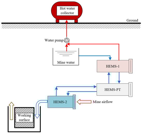 Deep mine water is a viable geothermal resource. The mine water temperature remains relatively stable throughout the year owing to the constant temperature within a mine. This resource is characterized by a high water temperature, significant heat capacity, and recyclability [54]. He et al. [55] proposed a deep mine cooling system, that is, a high-temperature exchange machinery system (HEMS), which utilizes mine water as a cold source for cooling. The HEMS comprises a cooling unit, pressure conversion unit, heating unit, and additional components [56]. The principle of the system is illustrated in Figure 10. The low-temperature chilled water produced by the refrigeration workstation (HEMS-1) is passed through a plate heat exchanger inside the pressure conversion workstation (HEMS-PT), where it underwent pressure conversion and heat exchange with the high-temperature return water from the cooling workstation (HEMS-2). The chilled water, after temperature reduction, is then used to cool the mine airflow via the air cooler of HEMS-2. The heat extracted by the HEMS serves as a heat source for ground heating and bathing facilities. The HEMS was used for air cooling at the working face of the Jiahe Coal Mine in China. The test results indicated that the working face temperature ranged between 26 °C and 29 °C. The results showed that the K value of the system was 1.5 and the M value was 3.5. Compared with conventional cooling systems, this system represented a temperature reduction of 4 °C to 6 °C and a relative humidity reduction of 3.6% to 17% [57]. This system effectively cools and dehumidifies the air at the working face, thereby enhancing the thermal comfort of miners. Han et al. [58] conducted an extensive investigation of the HEMS and revealed that at the working face of the Zhangshuanglou Coal Mine in China, when the air cooler outlet temperature was maintained at 18 °C with a relative humidity of 80%, some miners still reported discomfort. This study identified that the relative humidity of air within the working face was a critical parameter that influenced thermal comfort. Thermal comfort for all miners was achieved when the relative humidity of the air was maintained between 60% and 75%.