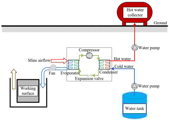Gao et al. [59] introduced a heat pump integrated system capable of adapting to variable working conditions for both heat storage and cooling. The ground heat exchanger absorbed condensation heat to warm the bathing water while the evaporator of the water-source heat pump (WSHP) supplied refrigeration capacity to regulate the air temperature within the mine working face. The research findings indicated that compared with the GCRCS, the system achieved an energy-saving rate of 26.2% in its refrigeration cycle, corresponding to an energy savings of 321.48 ton of standard coal equivalent. The principle of the WSHP mine cooling system is illustrated in Figure 11. Feng et al. [60] introduced a coupled mine cooling and WSHP system utilizing mine water as both a cooling and heating source. In summer, chilled water was produced for air cooling, whereas in winter, low-temperature hot water was generated for wellbore antifreeze. The measurement results indicated that this system reduced the air temperature by 3–5 °C and relative humidity by 10–15%. The application of heat pump technology in mine cooling not only reduces the air temperature at the working face but also supplies thermal energy, thereby enabling simultaneous cooling and heating services while promoting cascaded energy utilization [61].