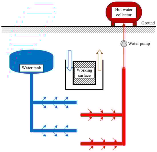 The coordinated cooling technology of surrounding-rock geothermal mining can solve the problem of deep-mine heat damage. Geothermal resources residing within the surrounding rocks of deep mines are abundant and possess significant recyclability. Harnessing the geothermal energy of the surrounding rock can effectively lower the temperature of deep mines, thereby reducing the thermal load on the working face and decreasing the working face temperature. Xu et al. [64] introduced a deep-mine geothermal-energy collaborative mine cooling technology aimed at mitigating mine heat damage while utilizing geothermal resources. The principle of the system is illustrated in Figure 12. The system employs separate injection and regenerative wells. Cold water is used as a cooling medium. Via the injection well, heat exchange occurs between the cold water and high-temperature mine airflow. This process simultaneously reduces the air temperature while increasing the water temperature. The extracted hot water is then conveyed to the ground through a regenerative well for thermal application. To further investigate this technology, Xu et al. [65] conducted experimental tests and numerical simulations focusing on the water injection temperature, time, and rate. Lowering the water injection temperature, extending the injection time, and increasing the injection rate enhanced the refrigeration efficiency. The application of downhole water-injection cooling combined with synergistic geothermal mining technology may destabilize underground production and significantly disrupt the thermo-hydro-mechanical (THM) coupling process. Zhang et al. [66] assessed the impact of geothermal energy extraction on mine temperature and stability. By developing a THM mathematical model to simulate mechanical stability and temperature distribution, the results demonstrated that under favorable geological conditions, optimizing system design parameters enhanced geothermal energy extraction and reduced mine temperatures.