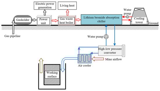 To address the excessive energy consumption of conventional deep mine cooling systems, CCHP technology has been implemented, enabling simultaneous heating, electricity generation, and cooling. This technology harnesses high-grade fuel energy for electricity generation whereas low-grade residual heat is utilized for heating and refrigeration, thereby enabling cascaded energy utilization [67]. The principle of the CCHP system is shown in Figure 13. During the process of mine extraction, heat damage issues arise from high gas concentrations and temperatures. Following the principles of energy recovery and utilization, gas serves as a fuel for electricity generation, and the generated waste heat drives a lithium bromide absorption chiller to produce cooling energy, thereby reducing the working face air temperature. Additionally, waste heat can be utilized to generate hot water for domestic heating [68]. Yang et al. [69] implemented a CCHP technology to effectively control gas hazards and high-temperature environments in the Huainan mining area in China. The results demonstrated that this approach reduced the working-face air temperature by 5 °C. Relative humidity was reduced by 20% and 0.6 MPa of saturated steam was generated. This steam was used to drive a lithium bromide absorption chiller and provide domestic heating, thereby enhancing the energy utilization efficiency. Yang et al. [70] employed a lithium bromide absorption chiller to cool mine air, with a WSHP system serving as an auxiliary heat source. The heated mine water served as a heat source to warm the diluted lithium bromide solution within the generator. Simulations revealed that, at an air supply velocity of 11 m/s, the heading face temperature reached 24 °C, achieving a more comfortable air temperature.