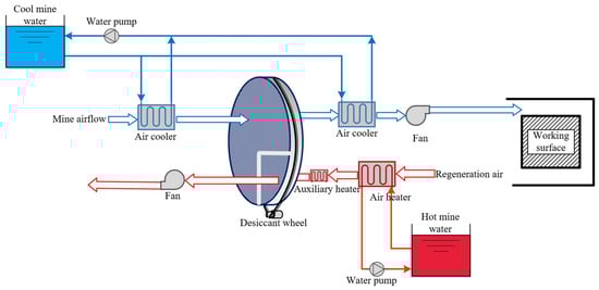 Solid adsorption devices are categorized into two types: fixed adsorption beds and desiccant wheel dehumidifiers. Fixed adsorption beds arrange adsorbent materials within a stationary bed. As wet air passes through the bed, the adsorbent removes the moisture, yielding dry air. Thermal regeneration is required to restore the dehumidification capacity of the adsorbent [73]. In a desiccant wheel system (DWS), wet air passes through the process sector, where the desiccant material adsorbs water vapor, thereby achieving dehumidification. Heated regeneration air is introduced to desorb moisture, after which the desiccant material, now moisture-laden, is rotated via the motor to complete the cycle of dehumidification and regeneration [74,75]. Lin et al. [76] had applied solid adsorption beds to deep mine dehumidification, investigating the impact of adsorbent thickness on dehumidification efficiency. The experimental results indicated that when the adsorbent thickness was less than 5 cm, the dehumidification capacity improved with increasing thickness, reducing the relative humidity from 90.5% to 55.5% within one hour. Chen et al. [77] introduced a deep-mine DWS cooling system driven by a heat storage matrix. The DWS removed moisture from the air. The heat storage matrix supplied thermal energy for air regeneration whereas mine water served as a cooling medium for the air cooler. This system not only cooled and dehumidified the working face air, but also optimized waste heat utilization, thereby reducing energy consumption. The results demonstrated that the system reduced air temperature by 8.9 °C and relative humidity by 52.9%. Ji et al. [78] utilized mine water at varying temperatures to supply heating and cooling energy to the DWS, achieving a humidity ratio difference of over 15.0 g/kg between the inlet and outlet. The principle of the mine-water-driven DWS cooling system is illustrated in Figure 14.