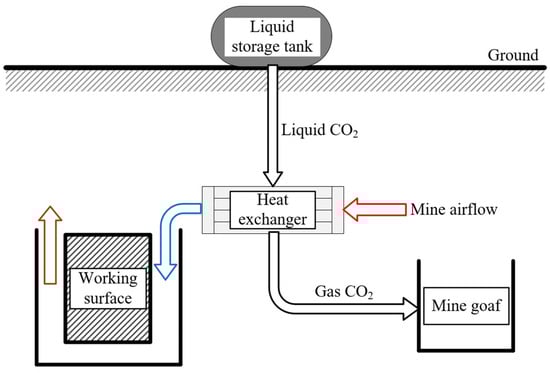 Liquid-phase-change refrigeration technology operates on the principle that liquids absorb significant heat during vaporization to achieve cooling. During mine cooling, liquid CO2 is used as a coolant. Liquid CO2 is transported via pipelines to underground heat exchangers, where it exchanges heat with high-temperature air at the mine working face. Liquid CO2 absorbs heat from the air, undergoes a phase change, and cools the air at the working face. The resulting gaseous CO2 is further injected into the mine goaf to prevent the spontaneous combustion of coal. The principle of applying liquid-phase-change refrigeration technology to deep mine cooling is illustrated in Figure 15.