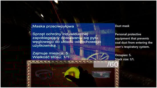 A research project was carried out by JSW Nowe Projekty S.A. (ul. Ignacego Paderewskiego 41, 40-282 Katowice, Poland), Główny Instytut Górnictwa—Państwowy Instytut Badawczy (plac Gwarków 1, 40-160 Katowice, Poland), JSW Szkolenie i Górnictwo Sp. z o.o. at Jastrzębska Spółka Węglowa Capital Group (ul. Górnicza 1, 44-335 Jastrzębie-Zdrój, Poland) regarding the development and implementation of effective training using a virtual reality environment. Figure 1 and Figure 2 show exemplary views from the developed VR application. Figure 2 shows the visual information that appears to the user during training. This information briefly describes what a dust mask is and what its function is. It also shows quantitative information about other personal protective equipment (PPE) the user has already had.