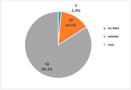 The study included 69 participants who took part in the training. Men made up 84.1% of the group (Figure 4), while 14.5% of participants were women. There were no data available for the remaining 1.4%. The majority of respondents had higher education (60.9%), followed by those with secondary education (34.8%), and a small percentage (2.9%) had basic education. There were no data available for one participant. The largest group consisted of workers with less than 5 years of work experience (44.9%). This was followed by participants with 5 to 20 years of experience (20.3%). Those with 20 to 25 years of experience made up 17.4% of the group, while 15.9% had more than 25 years of work experience.