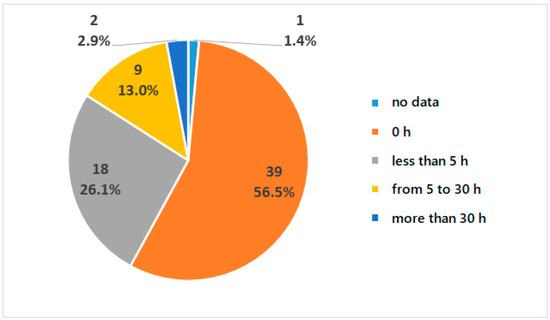 Despite quite commonly declared previous contact with VR, over half of the respondents declared that they did not play computer games at all (56.5%). A quarter of the respondents spend up to 5 h a week on such entertainment (26.1%), and approximately one in seven respondents (13.0%) reported playing games for 5 to 30 h a week. Only a small fraction of participants (2.9%) devote more than 30 h a week to gaming. Figure 6 presents detailed data.