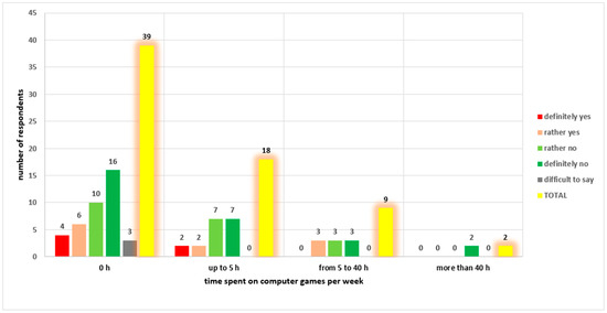 In order to complement the analysis presented above, respondents’ declarations of fatigue were compared with the time they spend playing computer games. Figure 8 contains a synthesis of the obtained results. The data contained therein indicate that there is no significant correlation between the compiled variables. Contrary to initial expectations, it turned out that a similar level of fatigue from participating in training was declared by people who do not play computer games and those who frequently use this form of entertainment, although the relatively small number of respondents does not allow for categorical conclusions on this matter.