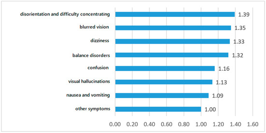 This conclusion is confirmed by the analysis of average ratings presented in Figure 9. All average ratings obtained indicating the intensity of unfavorable symptoms after removing the goggles should be assessed as very low. The respondents occasionally experienced minor symptoms of disorientation and difficulty concentrating, blurred vision, dizziness, and balance disorders.