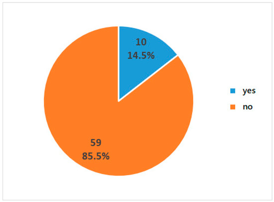 In the next part, the respondents were asked whether they took off their goggles before completing the training. The training lasted 50 min. It turned out that the vast majority (85.5%) did not take off the goggles before the end of the training (Figure 10). People who took off their goggles (14.5%) were asked about their reasons for doing so. The responses included indications of hardware and software problems (five cases), followed by excessive severity of psychophysical symptoms (two cases). Additionally, one person indicated dissatisfaction with the experience in VR and another pointed to external interference.