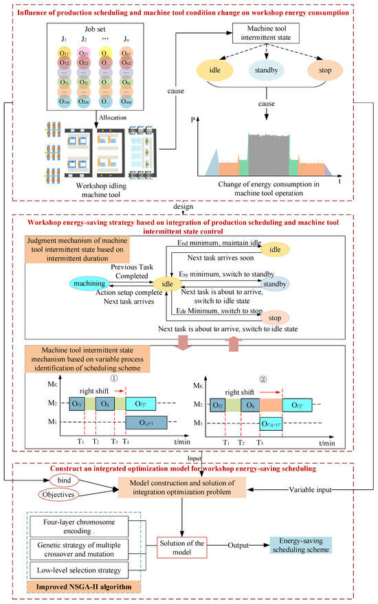The chapter arrangement of this paper is as follows: Section 2 introduces the workshop energy-saving scheduling problem integrated with intermittent state control, and proposes an integrated energy-saving optimization strategy for the workshop. Section 3 establishes a multi-objective integrated optimization model. Section 4 presents an improved NSGA-II algorithm. Section 5 evaluates and compares the proposed method through experiments. Finally, Section 6 provides conclusions and discusses future research directions. The overall framework is illustrated in Figure 1.