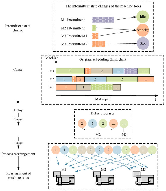 The scheduling scheme typically determines the intermittent durations of machine tools, imposing strong constraints on the decision-making process of intermittent state control, and consequently increasing intermittent energy consumption. Therefore, to reduce unnecessary machine intermittent duration and associated energy waste, it is essential to rationally arrange production scheduling through optimized operation sequencing and machine selection, thereby enhancing overall production efficiency. The strong constraining effect of production scheduling on intermittent state control is illustrated in Figure 2.