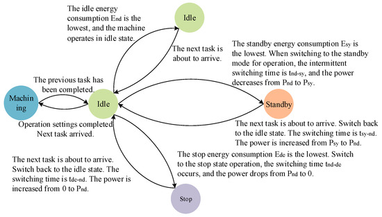 The three intermittent states of machine tools—idle, standby, and stop—exhibit significant differences in energy consumption. The effective reduction in workshop intermittent energy consumption can be achieved by accurately determining machine states and controlling their low-energy operation. Upon completion of production scheduling decisions, the feasible intermittent state set for each intermittent period is obtained based on machine intermittent duration. The energy consumption of each state in the set is then calculated, and the state with minimal energy demand is selected for operation: (1) idle mode is maintained when it demonstrates the lowest energy consumption, (2) standby mode is activated when it proves most energy-saving, or (3) stop is implemented when it yields minimal energy waste. This optimal state selection ensures the most energy-saving intermittent performance, thereby eliminating unnecessary energy dissipation. Concurrently, machines are controlled to transition back to machining states before subsequent operations arrive. As illustrated in Figure 4, this determination mechanism significantly reduces machine intermittent energy consumption, and enhances overall workshop energy utilization efficiency.