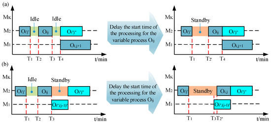 An example of a machine tool intermittent state adjustment mechanism based on variable operation identification in scheduling schemes is shown in Figure 5, where operation denotes the preceding operation of on machine , operation represents the succeeding operation of on machine , and operation indicates the subsequent operation within the same job . In the actual workshop production, it is essential to consider temporal constraints between each operation and its machine-specific predecessor/successor operations, and its job-inherent subsequent operation. Therefore, the variable operations that can adjust their start time of machining can be identified, providing the foundation for intermittent state control to feedback-optimize scheduling decisions through two scenarios.