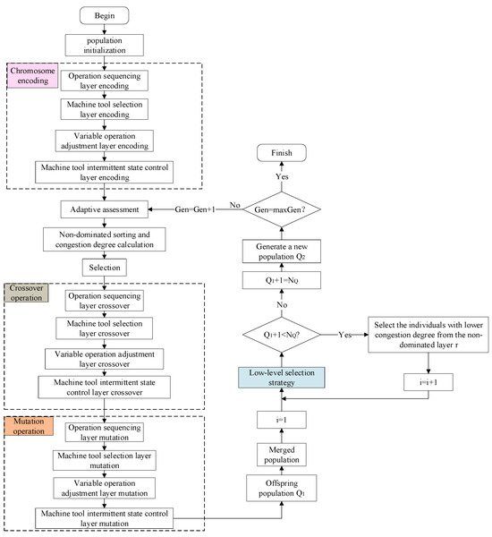 The NSGA-II algorithm proposed by Deb et al. has demonstrated excellent performance in solving multi-objective optimization problems [41]. However, when applied to integrated workshop energy-saving scheduling with intermittent state control, it fails to achieve the co-optimization of production scheduling and intermittent state control, often suffering from premature convergence or local optima. To this end, a four-layer chromosome encoding method, which considers operation sequencing, machine tool selection, and machine tool intermittent state control, is designed by integrating the energy-saving optimization strategy into the chromosome encoding mechanism. Furthermore, multiple crossover and mutation genetic operators are introduced, and, combined with a lower-level selection strategy, the algorithm is improved. The framework of the improved NSGA-II algorithm is shown in Figure 6.
