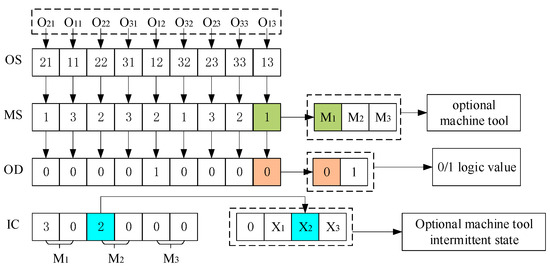Figure 7 illustrates a four-layer chromosome encoding sequence. The first layer, Operation Sequencing (OS), encodes with job operation numbers (e.g., ‘21’ in sequence (21,11,22,31,12,32,23,33,13) represents the first operation of job 2). The second layer, Machine Selection (MS), uses indices to designate machines from the available set (, ,) for each operation (e.g., ‘1’ in sequence (1,3,2,3,2,1,3,2,1) assigns operation to machine ). The third layer, Variable Operation Adjustment (OD), employs logic values (0/1) to flag whether allows start-time adjustments (1 = adjustable, 0 = fixed). The fourth layer, Intermittent State Control (IC), selects energy-optimal states from the set (0,, , ) (e.g., ‘2’ in sequence (3,0,2,0,0,0) indicates standby mode for machine during its first intermittent period, while ‘0’ denotes no intermittent state activation for in the second intermittent). Notably, the OS, MS, and OD layers share equal length as they follow the operation order, whereas the IC layer sequentially processes each machine’s inter-operation intermittent durations derived from the preceding layers.