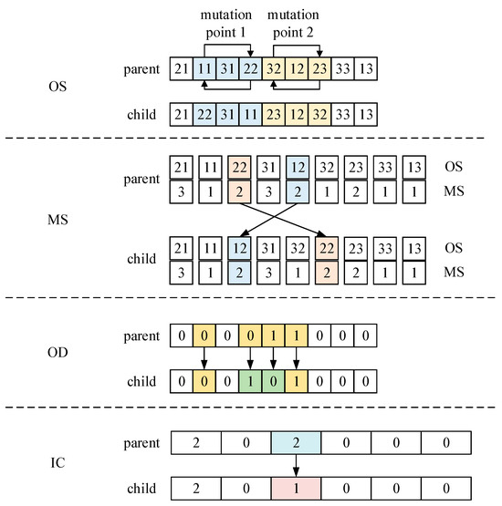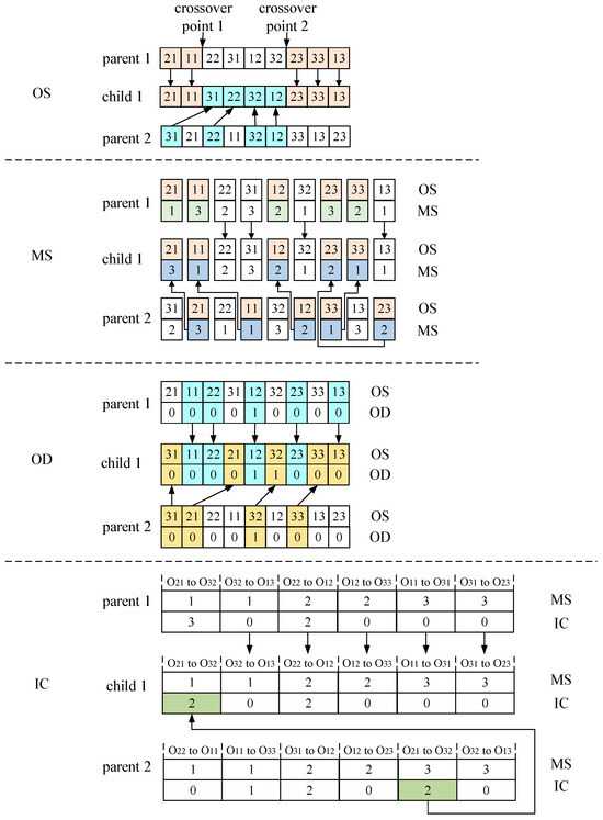 Figure 8 illustrates the crossover operation process, which consists of the following four steps: (1) OS crossover. Two crossover points are randomly selected in parent 1. The gene sequence to the left of crossover point 1 is copied to the left side of child 1, while the sequence to the right of crossover point 2 is copied to the right side of child 1. Subsequently, the remaining positions in child 1 are filled with distinct gene sequences selected from parent 2. (2) MS crossover. The OS portion of parent 1 is directly copied to child 1. Then, a set of randomly selected operations are chosen, and their corresponding MS portions from parent 1 are copied to child 1, with these operations being marked. For the unmarked operations, the corresponding MS portions from parent 2 are used to fill the remaining positions in child 1. (3) OD crossover. A number of gene sequences are randomly selected from parent 1 and copied to child 1. The remaining positions in child 1 are then sequentially filled with distinct gene sequences from parent 2. (4) IC crossover. A set of crossable IC sequences are randomly selected from parent 2 and copied to the corresponding positions in child 1. The remaining positions are filled with the corresponding IC sequences from parent 1 in sequence.