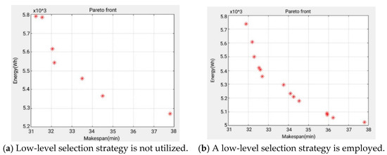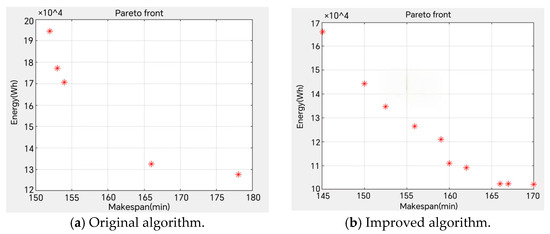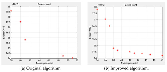Furthermore, to further validate the superiority of the improved NSGA-II algorithm with the low-level selection strategy, comparative experiments are conducted against the original algorithm. The resulting pareto front solutions are shown in Figure 14. The results demonstrate two key advantages of the improved algorithm: (1) It obtains higher-quality solutions for the integrated optimization problem. (2) It achieves better performance in both workshop energy consumption and makespan. These enhancements translate to significant reductions in production cycle times and overall energy usage, and the low-level selection strategy proves particularly effective.