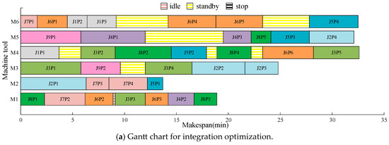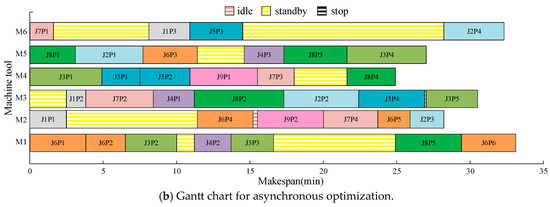 To validate the energy-saving effects of the proposed integrated optimization method, the information in Table 6 and Table 7 is used. The proposed integrated optimization model, combined with the improved genetic algorithm, is applied to solve and verify the case. A comparative analysis is conducted with the asynchronous optimization method. In the asynchronous optimization method, encoding is first performed for the operation sequencing layer, machine selection layer, and variable operation adjustment layer, with optimization focusing on minimizing total workshop energy consumption and makespan while maintaining unchanged machine intermittent states. After obtaining pareto front solutions, the workshop energy-saving optimization strategy is applied to adjust the machine intermittent states. The integrated optimization results presented in Figure 12a demonstrate a makespan of 32.6 and total workshop energy consumption of 5376.875 , while the asynchronous optimization results shown in Figure 12b exhibit a makespan of 33.1 and energy consumption of 5594.846 . Upon completion of each machining process, all machines enter idle, standby, or stop state. Consequently, the scheduling decisions in the figures only display changes in machine intermittent states, with detailed state-switching processes omitted for enhanced visualization clarity.