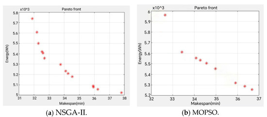 With total workshop energy consumption and makespan as the optimization objectives, the case study is solved using the two aforementioned algorithms, and the distribution of their obtained pareto front solutions is illustrated in Figure 15. The solution results represent the mean of multiple independent runs. A comprehensive comparison of solution performance between the NSGA-II and MOPSO algorithms in this practical application demonstrates that the improved NSGA-II algorithm exhibits superior optimization capability. Specifically, the improved NSGA-II algorithm yields a greater number of pareto front solutions with more uniform distribution, and demonstrates better ability to capture a potential solution set in the optimization space.