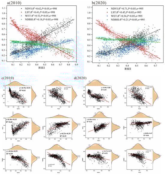 - The RSEI demonstrated stronger correlations with individual ecological indicators (NDVI, LST, NDBSI, WET) than between the indicators themselves, confirming its superior comprehensive representation of ecological quality. Among these, NDVI changes exerted the greatest influence on ecological quality, while NDBSI showed the least impact.