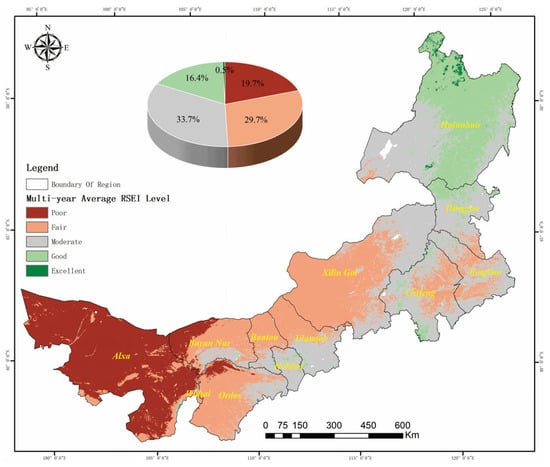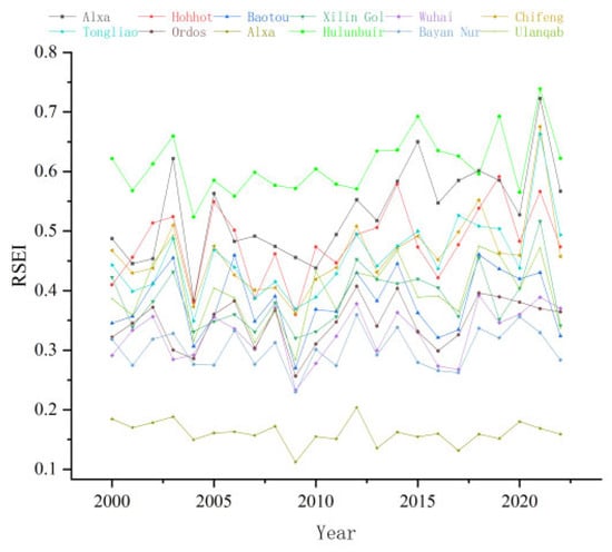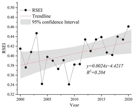- From 2000 to 2020, the average RSEI in Inner Mongolia showed an overall upward trend with fluctuations, which has been confirmed as statistically significant at a 95% confidence level. By analyzing the spatial transition matrix, it was found that different ecological positions have shifted over the 20-year period. The major area transitions occurred between adjacent two levels, with the area of improvement greater than the area of deterioration, indicating an overall improvement in ecological quality.