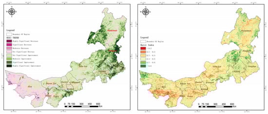 - Future projections suggest divergent trends: over 50% of regions (predominantly located west of the Greater Khingan Range) may undergo trend reversals, potentially due to climate change impacts and human pressure. Conversely, other areas are projected to maintain their current improvement trajectories, particularly where ecological protection policies have been consistently implemented. Driving factor analysis demonstrated the predominant influence of natural factors (NDVI, precipitation and temperature) on ecological changes. However, human activities exhibited amplified effects through interactive processes (e.g., GDP × precipitation synergy). Remarkably, these interaction effects accounted for an additional 22% of spatial variance beyond what single factors could explain, highlighting the complex nature of ecological quality dynamics in arid and semi-arid environments.