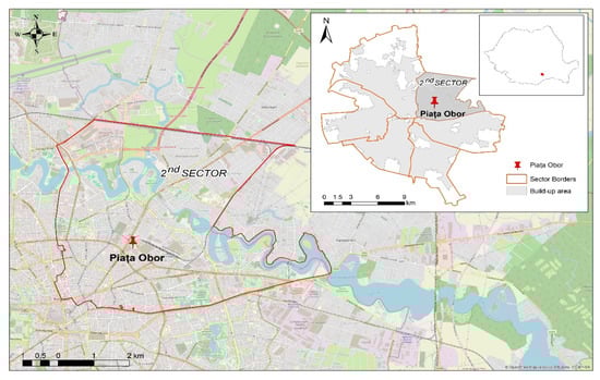 The Obor Market is situated in Sector 2 of Bucharest, specifically on Ziduri Moși Street in the central–eastern part of the city. It is located at the intersection of Ștefan cel Mare Road and Calea Moșilor, approximately 1.5 km from the city centre (Figure 1) [80]. The term ‘obor,’ as defined by the explanatory dictionary of the Romanian language, refers to an enclosed area where livestock fairs were historically held on the outskirts of the city. As Bucharest expanded, these livestock fairs relocated, eventually establishing the current site of the Obor Market [81].