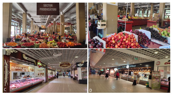 (A,B) Local producers’ section for vegetables (A) and fruits (B). (C,D) Upper floor section with meat (C) and cheeses (D). (Source: personal archive).
