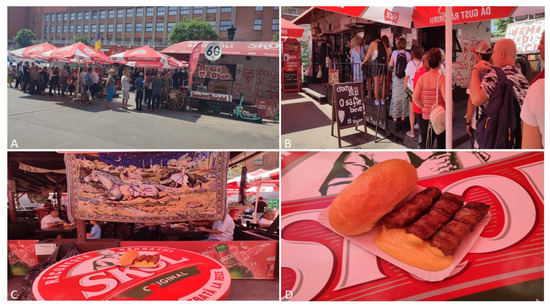 Images from Obor Market—street food sector. Lines for mititei where locals and tourists are waiting (A,B); Obor Terrace, one of the places where mititei are served (C). Delicious mititei with mustard (D). (Source: personal archive).