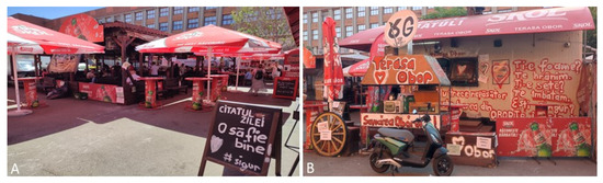 Both the market and the events held there (harvest festivals and OctObor Fest) are promoted on Facebook and Instagram pages, according to information gathered from an interview with a market representative. However, it benefits from the most significant promotion both online and physically from the entrepreneurs within the market (the mititei sellers), who try to attract customers through various naive marketing forms, such as motivational quotes (“Veni, vidi, mici!”; “It will be fine! #sure”; “Strong essences are kept in small bottles,” etc.) inserted into a decor abundant with objects and colours (Figure 5).