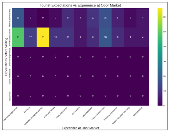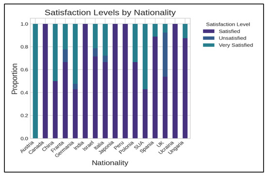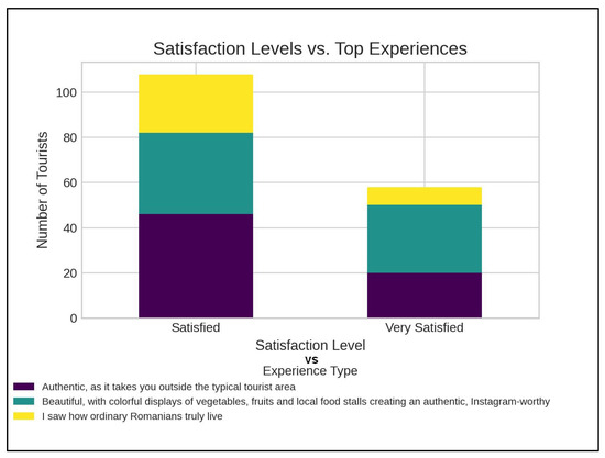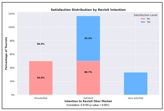 The satisfaction levels stratified by nationality reveals significant heterogeneity in tourist experiences at Obor Market. Statistical analysis indicates a strong association between nationality and satisfaction levels (χ2 = 102.87, p < 0.001), suggesting that cultural background substantially influences market perception. Austrian visitors demonstrated the highest satisfaction rates with 100% reporting being “very satisfied”, followed by American (57.14%) and German (52.38%) tourists. This pattern may reflect varying cultural expectations regarding traditional markets, with Western tourists potentially experiencing greater novelty value compared to visitors from regions with similar market traditions. The significant chi-square test result confirms that these differences are unlikely to be due to chance, indicating that nationality is a meaningful predictor of market satisfaction (Figure 7).