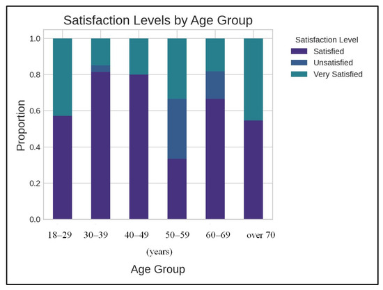 Age demographics exhibit distinct patterns in market satisfaction, with statistical significance (χ2 = 56.42, p < 0.001) confirming the relationship between age and satisfaction levels. The highest proportion of “very satisfied” responses was observed among seniors over 70 years (45.45%) and young adults aged 18–29 (42.86%), while middle-aged visitors (30–39 years) reported the lowest proportion of high satisfaction (14.81%) (Figure 8). This U-shaped satisfaction distribution suggests that Obor Market appeals differently across generational cohorts. Older visitors may appreciate the market’s traditional aspects and authenticity, while younger tourists might value the experiential and social media-worthy aspects. The middle-aged demographic’s lower satisfaction could reflect different expectations or priorities during travel, potentially related to convenience or efficiency factors that may be less optimized in traditional market settings.