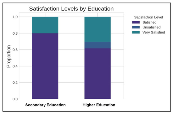 The majority (84.8%) of respondents reported having higher education, with 80.0% of this group being satisfied with their visit. In contrast, although the secondary education group had a 100% positive satisfaction rate (when combining satisfied and very satisfied), the proportion who reported being “very satisfied” was lower at 20.0% compared to 30.4% for those with higher education (Figure 9).