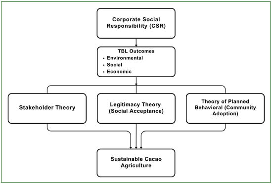 Conceptual Research Framework. This framework illustrates how Corporate Social Responsibility (CSR) contributes to environmental, social, and economic outcomes through the Triple-Bottom-Line (TBL) lens. These outcomes are shaped and validated through three interlinked theories—Stakeholder Theory, Legitimacy Theory (social acceptance), and the Theory of Planned Behavior (community adoption)—which collectively underpin the transition toward sustainable cacao agriculture. Source: Authors’ conceptual design based on CSR, TBL, TPB, Stakeholder Theory, and Legitimacy Theory.