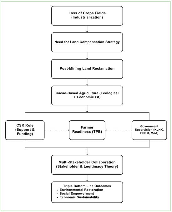 Indonesia’s post-mining landscapes require an integrated governance approach to achieve equitable and sustainable reclamation. This study developed and evaluated the TILANG Framework (Triple-Bottom-Line Integrated Land Governance) as a multidimensional model that aligns ecological restoration, community empowerment, and institutional accountability. Based on a meta-synthesis of 773 academic and institutional remarks coded using NVivo 12, the study identified sustainable cacao agriculture as a viable compensation mechanism that supports livelihood recovery while restoring degraded land. The framework draws on six foundational theoretical components—Corporate Social Responsibility (CSR), Stakeholder Theory, Legitimacy Theory, the Theory of Planned Behavior, the Triple Bottom Line, and multi-level governance—and is operationalized through six implementation principles: Trust, Inclusivity, Legitimacy, Alignment, Norms, and Governance. The findings support performance-based land reclamation by embedding behavioral readiness and institutional co-financing into sustainability strategies. This model is particularly relevant to Indonesia’s ongoing land-use transformation, where post-extractive zones are shifting toward agroecological and community-centered recovery. The study found that (1) reframing land compensation as a restorative, performance-based mechanism enables more legitimate and inclusive post-mining governance; (2) sustainable cacao agriculture represents a viable and socially accepted strategy for ecological recovery and rural livelihood revitalization; and (3) the TILANG Framework advances land-use transformation by integrating corporate responsibility, behavioral readiness, and multi-level governance into a cohesive performance model.