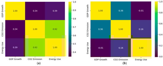 Energy Consumption and CO2 Emissions: To further visualize this bivariate association, we used heatmaps, a prevalent method in data analysis and machine learning for revealing the strength and direction of correlations between variables. As shown in Figure 3, patterns emerged across multiple countries. For instance, we observed a generally strong positive correlation between energy use per capita and CO2 emissions per capita, a finding consistent with the determinations of Hoy et al. (2023) [29] and Destek et al. (2020) [17], although with variations by country. More specifically we found that in the US, energy consumption and CO2 emissions are highly correlated (r = 0.92), while in Canada the correlation is markedly weaker (r = 0.16), suggesting the influence of divergent energy policies, technologies, or sectoral compositions. Among the BRICS countries, the correlation between energy consumption and CO2 emissions is uniformly strong.